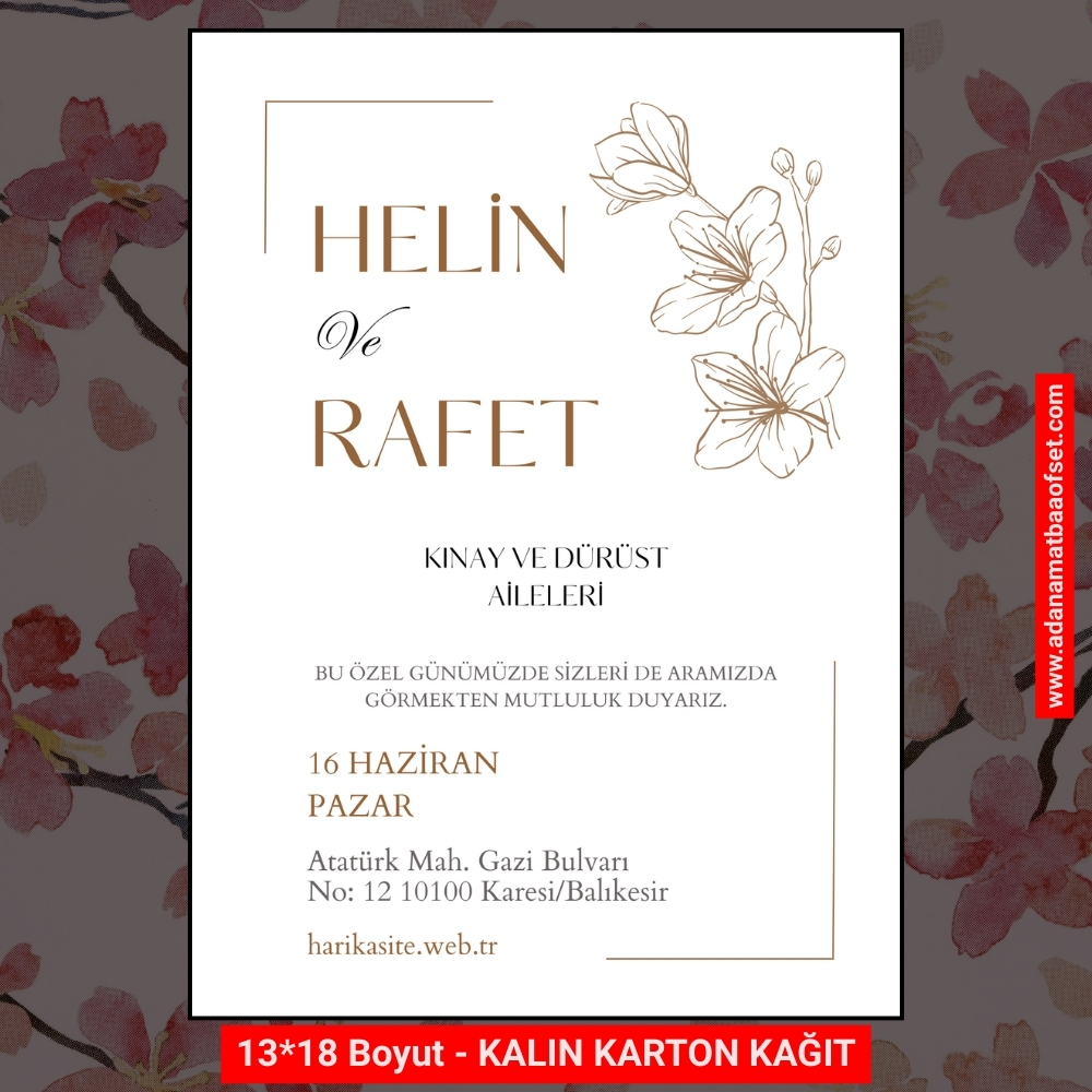 Kalın karton kağıttır.Diğerleri ile bizi karıştırmayın ! -Her adette baskı vardır. -Zarf Dahil Değildir.Zarf Fiyatı Baskısız 2.5 TL Baskılı fiyatı 3 TL'dir - Ortalama 2 iş gününde teslim - eve elden teslim Adana Davetiye basan yerler, Adana Davetiye , Adana davetiye fiyatları , Adana düğün davetiyesi , adana nişan davetiyesi
